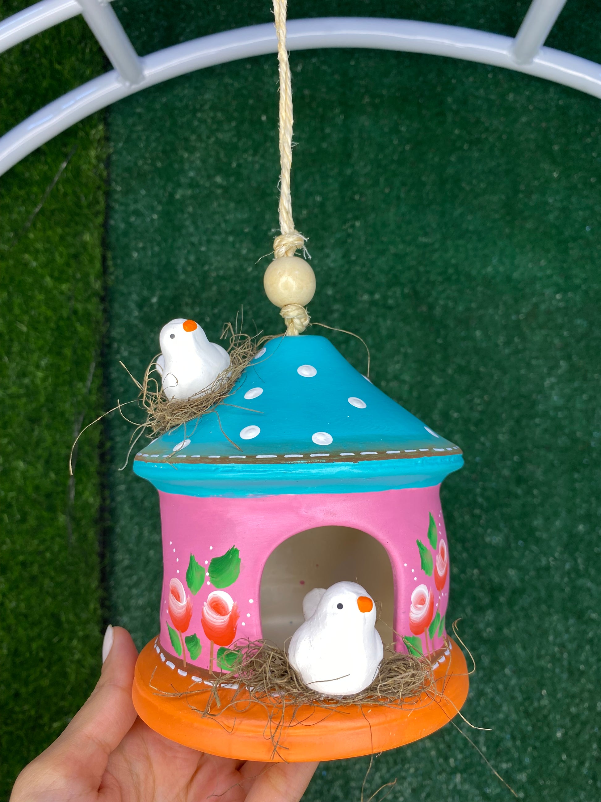 Casinha Pendente com Passarinhos – Cerâmica Pintada à Mão